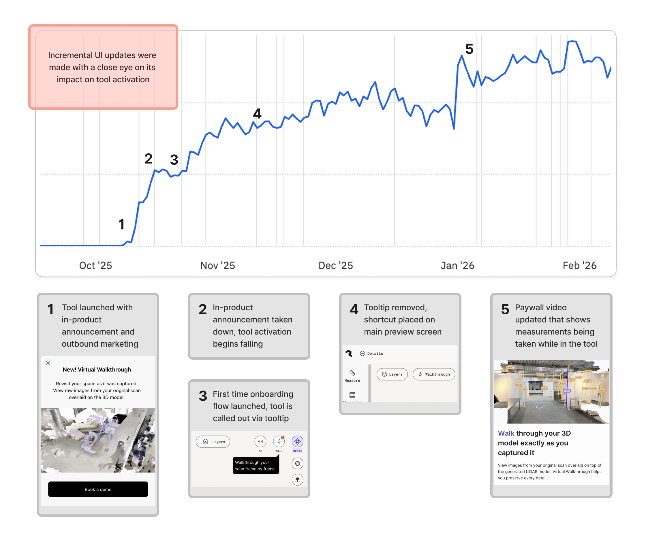 Initially designed with a collapsible menu, Virtual Walkthrough saw lower-than-expected activation due to discoverability issues rather than lack of utility. I identified this through usage data and added a contextual callout on first open, increasing daily activations from ~1,500 to over 3,000.